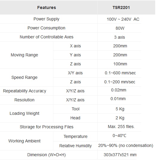 TSR2201 series robots have a maximum base work area of 200mm x 200mm and a up and down movement of 100mm.  With 3 axis indexing for lines or dots to flat or uneven substrates.  All robots are supplied with a pneumatic syringe controller, I/O cable, teach pendant, airline hoses, syringe bracket, slide adjustment and detailed instruction manuals for both hardward and software.